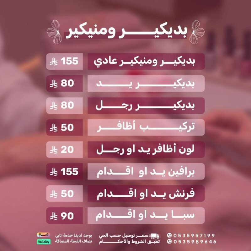 ✨ دللي يديك وقدميك مع خدمات بديكير ومانيكير احترافية وفاخرة. نهتم بصحة أظافرك وبشرتك لتكوني دائمًا بأجمل إطلالة. استمتعي بتلميع أظافرك بألوان عصرية تناسب كل الأذواق. مانيكير كلاسيكي أو جيل لتثبيت اللون وإبراز جمال أظافرك. بديكير فاخر يزيل الجلد الميت وينعم قدميك ويجعلها ناعمة كالحرير. جلسة استرخاء تمنحك شعور بالراحة والهدوء أثناء العناية بجمالك. نستخدم أفضل المنتجات لضمان صحة أظافرك ونتائج تدوم طويلًا. تشكيلة واسعة من الألوان والتصاميم لتختاري ما يناسب شخصيتك. خدماتنا مثالية لكل المناسبات اليومية والخاصة لتكوني متألقة دائمًا. خلي يديك وقدميك دائمًا في أبهى صورة واستمتعي بتجربة فاخرة لا تُنسى. 🌸